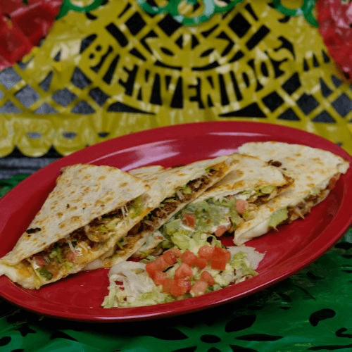 12 inch flour tortilla filled with mozzarella cheese, lettuce, tomato, onion, sour cream, guacamole and your choice of meat