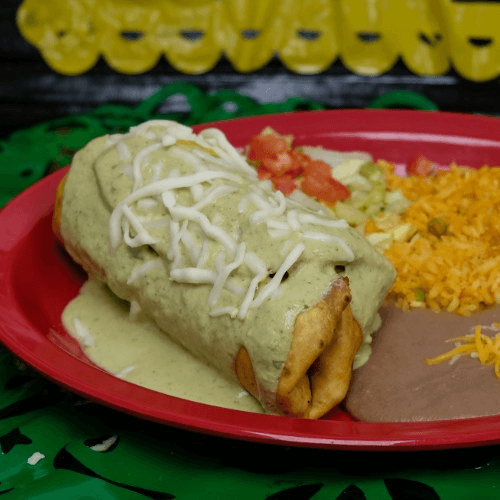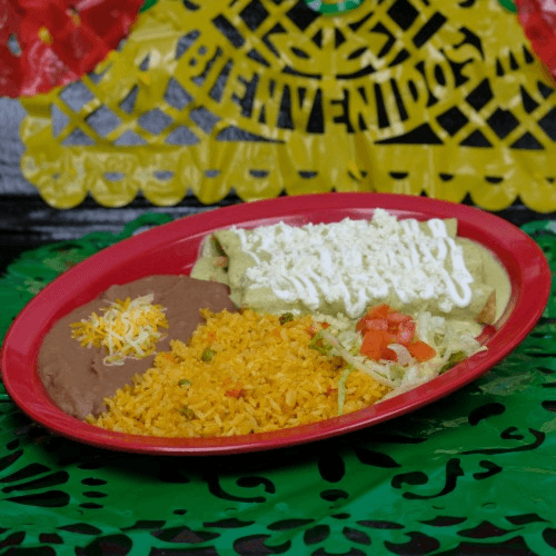 Fried tortillas filled with your choice of meat smothered in our queso, redo or avocado sauce topped with sour cream and queso fresco or Colby cheese