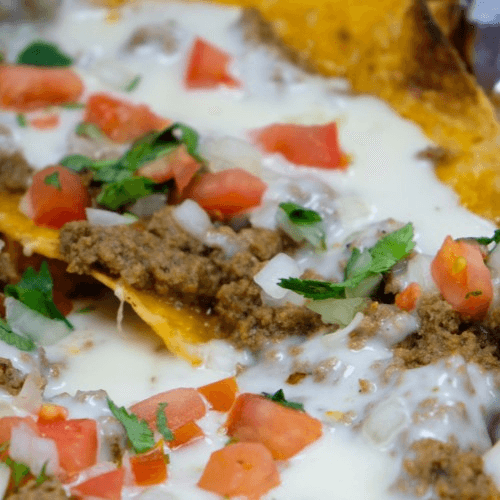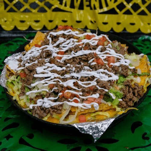Small portion of our homemade chips with melted cheese topped with beans, lettuce, tomatoes, onions, sour cream and your choice of meat