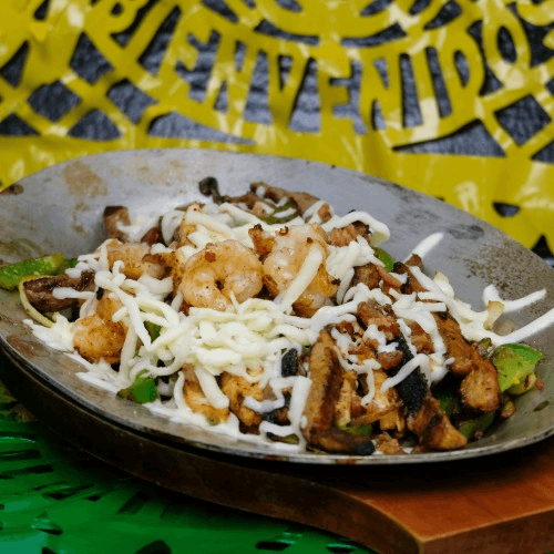 Our signature fajitas with steak, chicken and shrimp topped with mozzarella cheese and bacon served with rice, beans and an order of tortillas