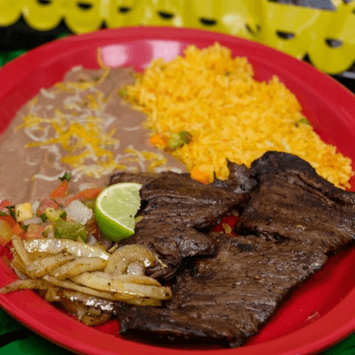 Thin and tender cut of steak seasoned with our blend of spices, served with grilled onions, pico de gallo, a side of rice and beans and an order of tortillas