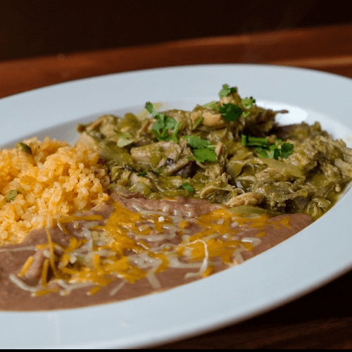 Fried tortillas smothered in our queso, red or avocado sauce, topped off with sour cream, queso fresco or Colby cheese served with a side of rice and beans