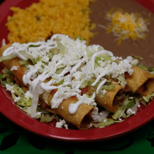 Three corn tortillas filled with shredded chicken, rolled and fried until crispy, on a bed of lettuce topped with our mild salsa and sour cream served with a side of rice and beans