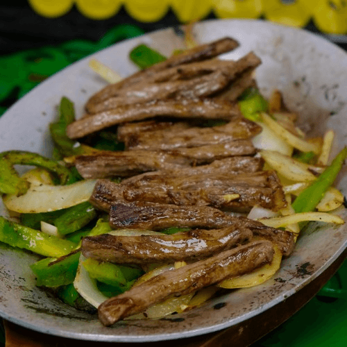 Our homemade spice blend sauteed with bell peppers, onions, grilled steak served with a side of rice and beans and an order of tortillas