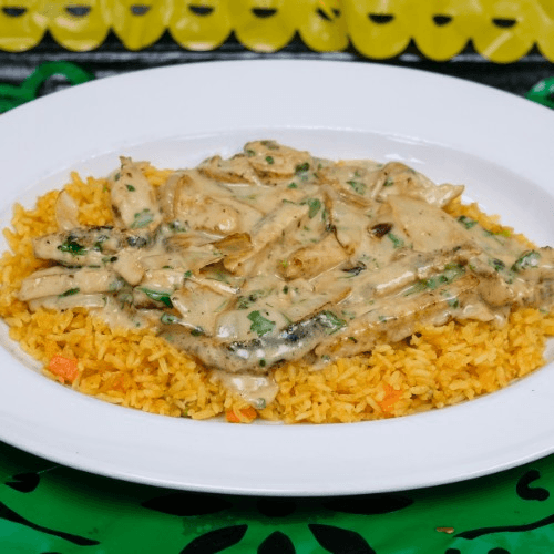 Creamy cremoso sauce with sauteed onions along with grilled chicken or shrimp served on a bed of rice