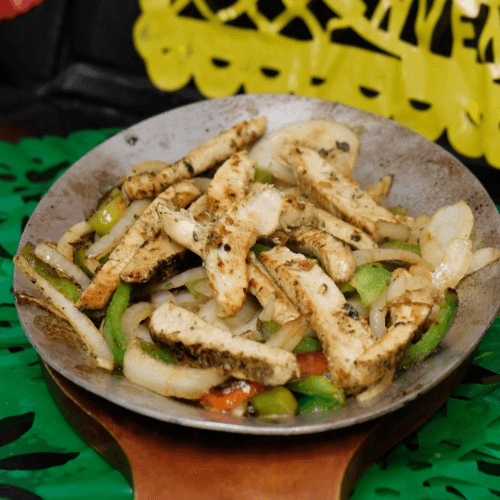 Our homemade spice blend sauteed with bell peppers, onions, grilled chicken served with a side of rice and beans and an order of tortillas