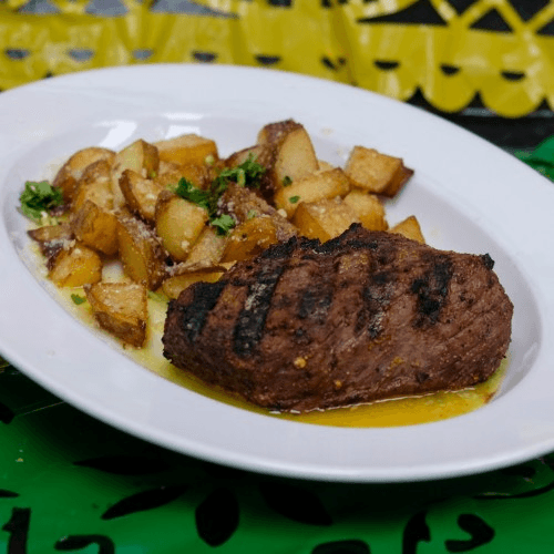 8 oz sirloin steak coated with our in house spice blend cook to the perfect temperature, served with a side of rice and beans or garlic butter potatoes