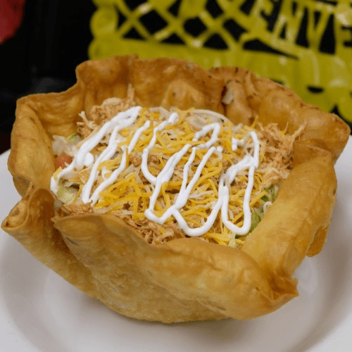 A large flour tortilla bowl filled with beans, rice, lettuce, tomatoes, onions, sour cream and your choice of meat