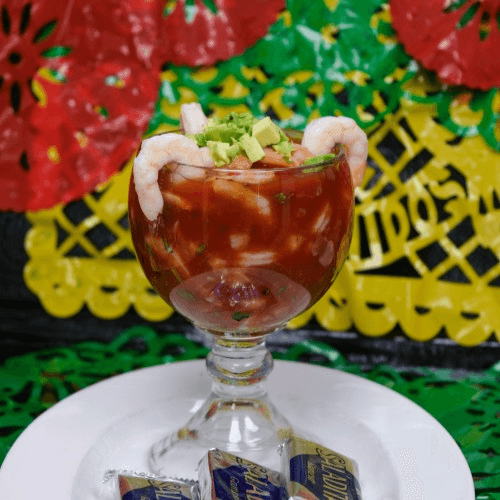 A Nice portion of shrimp in our special cocktail sauce, fresh chopped onions, cilantro, tomatoes and avocado served with tostadas or crackers