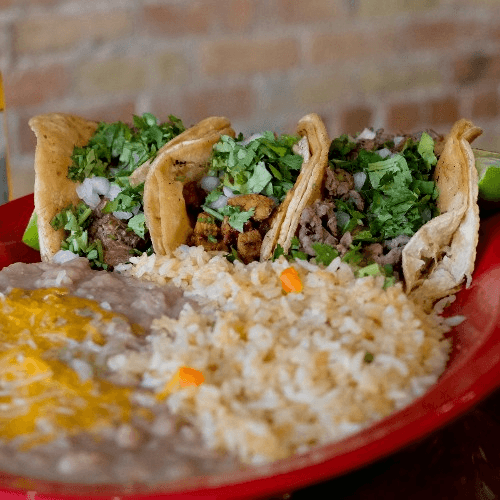 Three corn or flour tacos with your choice of meat and toppings, served with a side of rice and beans