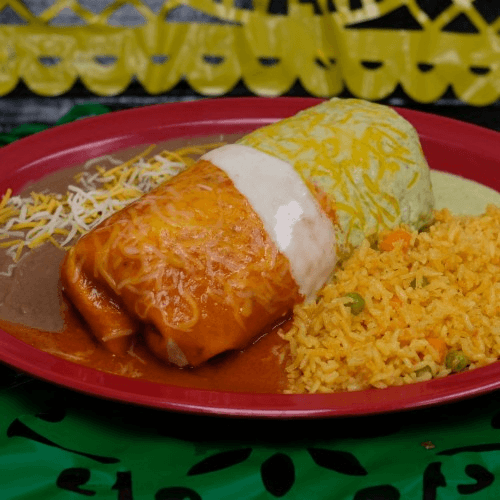 10 inch flour tortilla filled with beans, rice, your choice of 2 meats, lettuce, tomato, onions, sour cream, cheese and topped with the sauce of your choice