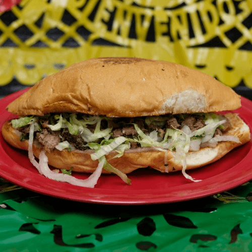 A Mexican sandwich served on a soft roll with beans, your choice of meat, lettuce, tomatoes, onions, sour cream, guacamole and cheese